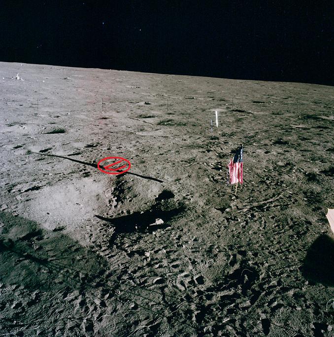 ![]() On this photo of the flag at the end of the mission (AS12-48-7160), we can see that at the location of the end of the flag's shadow, there is precisely a very convenient artifact I have circled. |