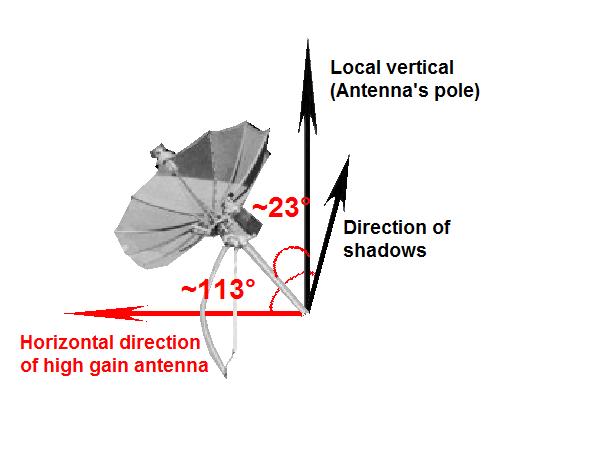 ![]() It means that the central branch of the high-gain antenna (and of the ALSEP) had to make with the local vertical an angle close to 23°, and horizontally, the central branch (of both the high gain antenna and the ALSEP) had to make with the direction of shadows an angle of around 113° left (so a little more than a quarter of a turn). We are going to see if it is the case on the photos of Apollo 12. |