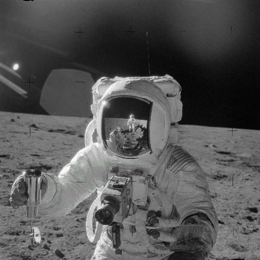 ![]() On this visor I have corrected the orientation of the photographer to turn him clockwise (except of course that, by inverting the astronaut, I have also inverted the direction of the sunlight). ![]() But there is still something more remarkable; look at the reflection of Pete Conrad in the visor: HE DOES NOT WEAR HIS BACKPACK. How can he breathe? |