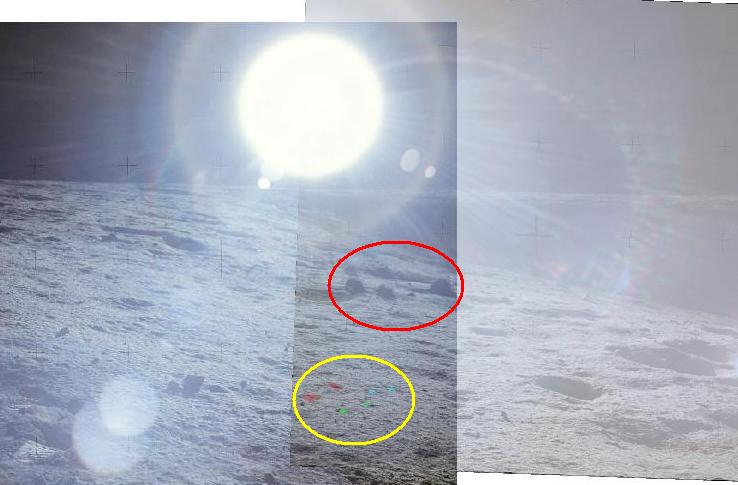![]() Here on the photos AS12-46-6767 and AS12-46-6768, the astronaut is near a crater and takes the sun which appears on the edge of the crater. On the second photo he turns his camera on the right, and the sun is pushed on the left of the photo. Apparently, nothing abnormal. ![]() On these photos we can see two things: - A triangle of stones I have circled in red. - And a triangle of holes I have circled in orange. We can see that the triangle of holes has slightly moved on the left relatively to the crater's edge (and also the triangle of stones), and that it's also a little farther. Consequently, the photographer has moved on the right and back between the two photos, moreover turning his camera. ![]() In order to make the holes more visible, I have colored them with different colors on the two photos (red, green and blue). ![]() Then, I make a superposition of the two photos with the colored holes, so that the crater's edges are as perfectly superposed as possible (i.e. I correct the orientation of the second photo to give it the same orientation as the first photo, and I put the second photo in the continuity of the first one). And what can we see on this superposition? We can see two replicas of the triangle of holes (the colored points). We should also see two replicas of the triangle of stones which is also closer to the photographer than the crater's edge. These two replicas would be closer to each other than the two replicas of the triangle of holes, but we should still see them, and we don't: The two triangles of stones are perfectly superposed. |