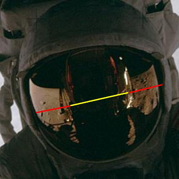 ![]() But, what they will have more trouble to explain is that, whereas the visor is curved, and thus the reflection of the horizon line should normally be curved, it appears straight, like the visor was flat. |
