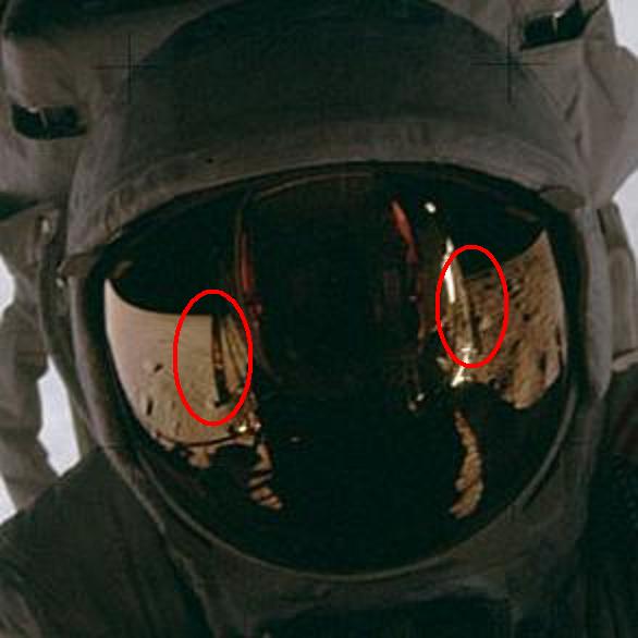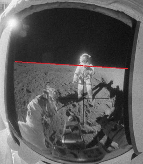 ![]() First, what is striking on this photo, and I am not the first one to notice it, is that the reflection of the horizon line in the visor is aligned with the horizon line of the photo. Of course, the Apollo believers are going to say that it is just a "coincidence". |