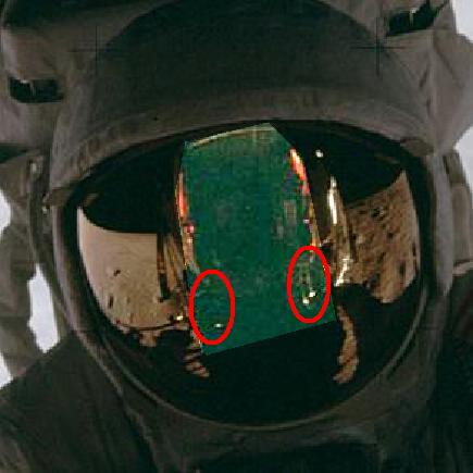 ![]() On photo AS12-48-7071, on the visor of the astronaut (right): On photo AS12-48-7071 (Figure I.17), on the visor of the astronaut (right): - We can’t see in the visor the shadow of what the astronaut is holding with his left hand (We should see a shadow between the shadow of his arm and the one of his body). - The reflection of Conrad's camera in his visor is strange, it seems to have legs. |