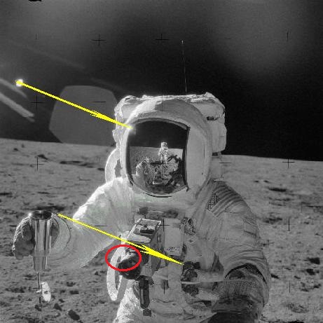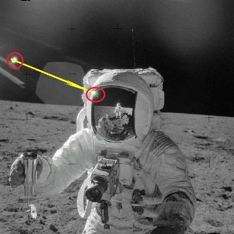 ![]() We can see the reflection of the sun on Bean's visor, and we can also see a lens flare; I have circled both of them, and, by joining them with a line, we obtain the exact direction of the sunlight. |