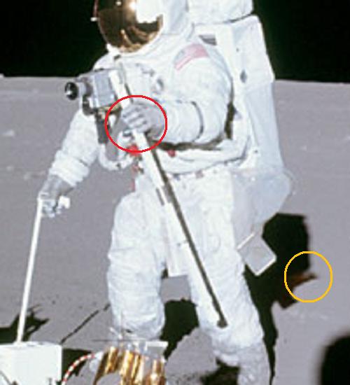 ![]() On photo AS12-47-6919, the way the shadow of the photographer looks, it would be surprising if he could take the photo! ![]() There's even better: Look how the astronaut is holding a stick in his left hand (I have circled it in red). The way he is holding it, we shouldn't see the shadow of the upper extremity of the stick...and yet we can see it (circled in orange)! |