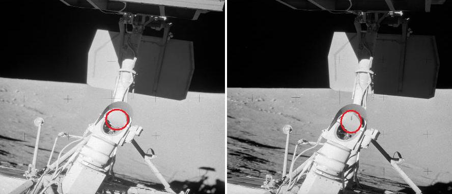 ![]() On the photo AS12-47-6916 (of which here is a close-up) there is an object (I have circled in red) which is not present on the photo AS12-47-8918. |