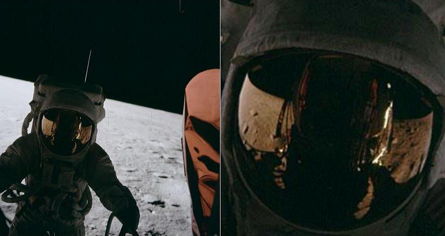 ![]() On the photo AS12-49-7281, we can see the reflection of the camera in the visor. |