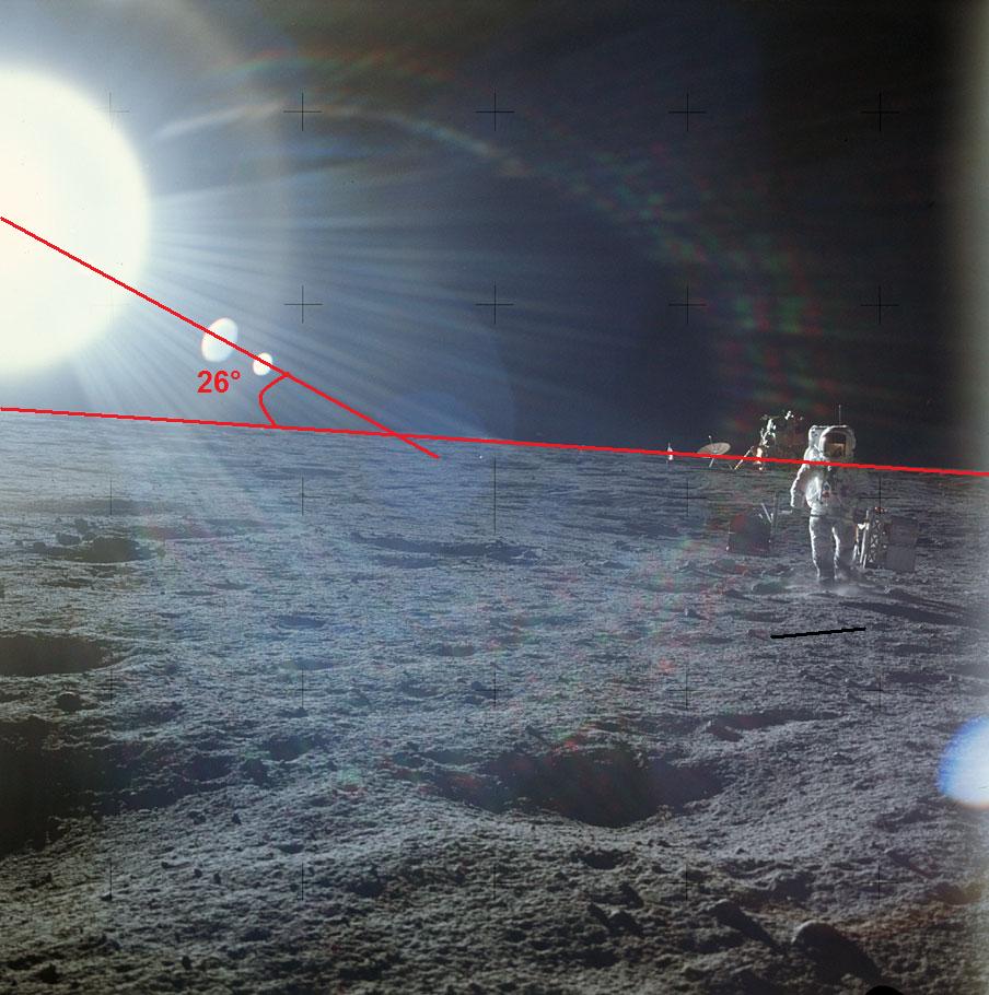 ![]() On the photographs of the sun, the fakers exceptionally gave us three reflections; the third one is inside the sun (if you don't see, then your contrast and luminosity may be badly adjusted). These three reflections allow us to draw the direction of the sun with a good accuracy. The fakers also gave us a good depth in the landscape, and a excellent horizon line. This allows us to measure the angle of the inclination of the sun at the start of the mission with quite a good precision. I drew the lines on a print copy, and I measured the angle between the lines and found an angle of 26°. |