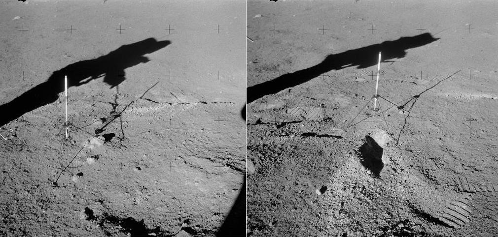 ![]() On photos AS12-49-7313 and AS12-49-7315, we have two views of the tripod; two of the legs have shadows which are close to each other, and the third leg has a shadow which is farther from the shadows of the two others. |