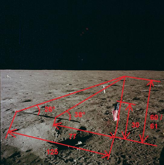 ![]() I have made a print copy and measured the two lengths of the shadow of the flag: I have found 125mm for the shadow's length at the beginning of the mission, and 77mm for the length at the end of the mission. Since we also have the angles of the direction of the sun at the beginning and the end of the mission, we can calculate at what height these lengths correspond. For the beginning of the mission: Flag's height = 125 * tan(26°) = 60.9 mm for the end of the mission: Flag's height = 77 * tan(38°) = 60.1 mm You can see that it's quite close! The problem is that when I measure the height of the flag on the same print copy, I only find 30mm, twice less! |