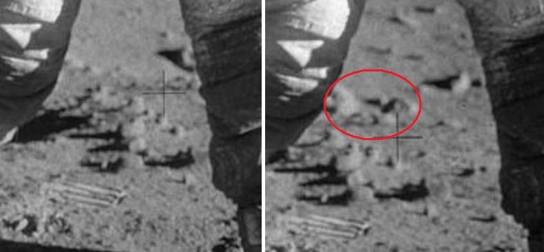 ![]() On this photo (AS12-46-6728), the alien's head is moving up. And the foot of the astronaut looks strange. |