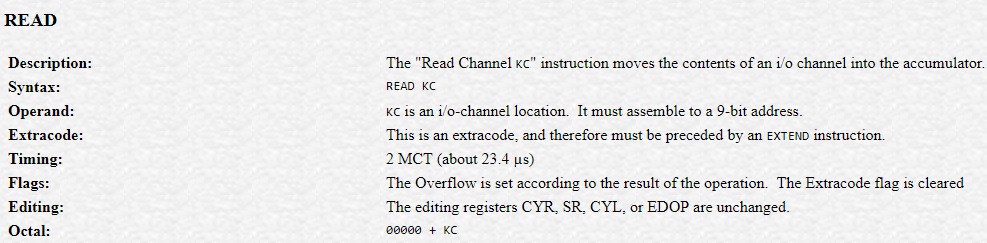 ![]() And precisely, the AGC had an IO read instruction, which means that it could perfectly have read the count of pulses from an electronic counter counting them. |