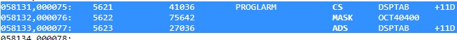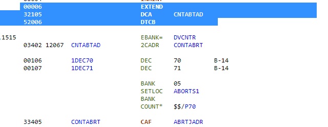 ![]() The instruction "CS DSPTAB" puts the negative contents of DSPTAB into the accumulator, the instruction "MASK OCT40400" makes an AND of the accumulator with a variable OCT40400, and the instruction "ADS DSPTAB" adds the contents of DSPTAB to the acculumator. Note that, since the variable DSPTAB is used twice in these three instructions, it would have been possible to do it with only two instructions, using DSPTAB only once. |