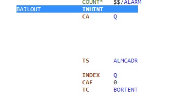 ![]() The instruction "TS ALMCADR" put the contents of the accumulator into the variable "ALMCADR". Remember, this variable had already been initialized with another value (the return address of the procedure BAILOUT), and it has not been used meanwhile, which means that the previous initialization was useless. |