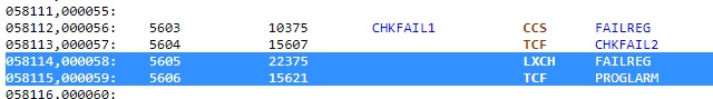 ![]() If we arrive on this label "CHKFAIL2", it means that the variable FAILREG was not greater than zero (otherwise the instruction "TCF PROGALARM" would have skipped it). The same test is made as at the label "CHKFAIL1", whith the same result. But, since we have arrived here because FAILREG was greater than zero, necessarily the next instruction "TCF FAIL3" will not be skipped, and this instruction jumps to the label FAIL3. |