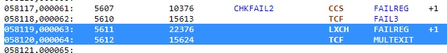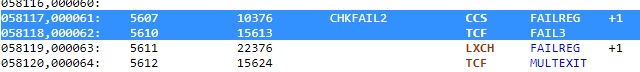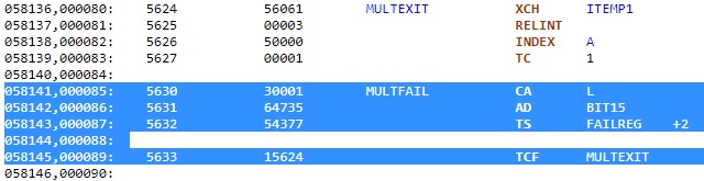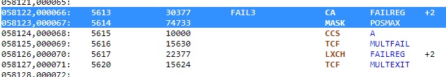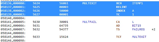 ![]() It also means that the two next instructions "LXCH FAILREG" and "TCF MULTEXIT" will never be executed, and so are totally useless. And the two previous instructions also are useless, for the next instruction has "FAIL3" as a label. |