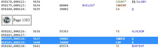 ![]() This is the entry point of the procedure BAILOUT. The first instruction which is executed, "INHINT", inhibits all interrupts, which means in particular that the display is frozen, and the keyboard does not respond. |