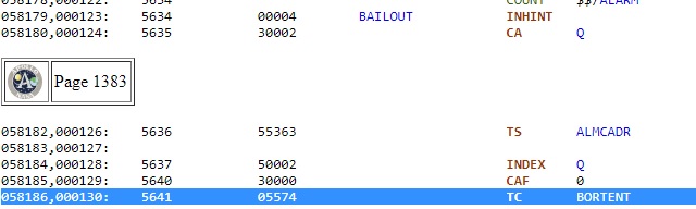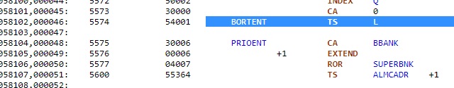 ![]() The instruction "CA Q" puts the contents of the register Q into the accumulator, and the instruction "TS ITEMP1" puts the contents of the accumulator into the variable ITEMP1. The register Q currently contains the return address of the procedure "BORTENT", so it means that the return address of BORTENT is put into the variable ITEMP1. |