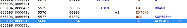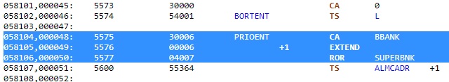 ![]() The instruction "CA BBANK" puts the contents of the variable BBANK into the accumulator. The couple of instructions "EXTEND" and "ROR SUPERBNK" makes an OR of the accumulator (which currently contains the variable BBANK) with an I/O variable SUPERBNK. What to do with? |