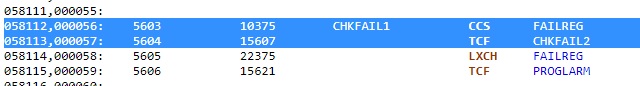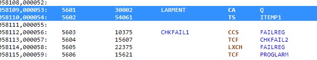 ![]() The instruction "CCS FAILREG" puts the decremented contents of FAILREG into the accumulator, but does not modify FAILREG; it tests the current contents of FAILREG, and skips the next instruction if it is null or less than zero. The next instruction "TCF CHKFAIL2" is executed if the current contents of FAILREG is greater than zero, and it jumps to the label CHKFAIL2. |