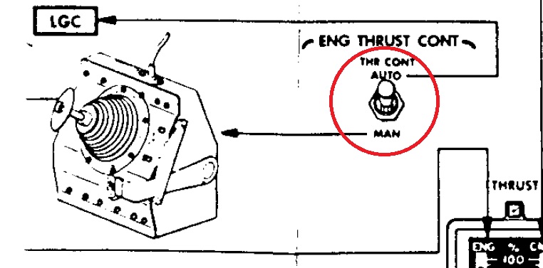 ![]() The thrust is controlled by either the handcontroller or the LGC, but not both in the same time. When the handcontroller has the control of the thrust, the LGC does not have the control on it at all (thrust control switch on "MAN" position), and, when the LGC has the control of the thrust, the handcontroller has no action whatsoever on it (thrust control switch on "AUTO" position). |