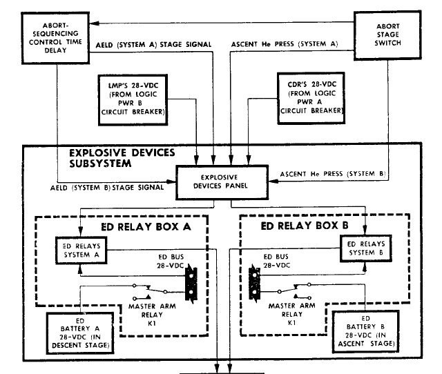 ![]() And the ABORT STAGE button was directly triggering the explosive system, the AGC could not prevent it from doing it. In the channels which were allowing the AGC to communicate with the LGC, there was no bit which was allowing the AGC to allow or inhibit the separation of stages. In fact, all the LETABORT bit was doing was to allow the descent program to be replaced with the ascent program. |