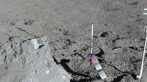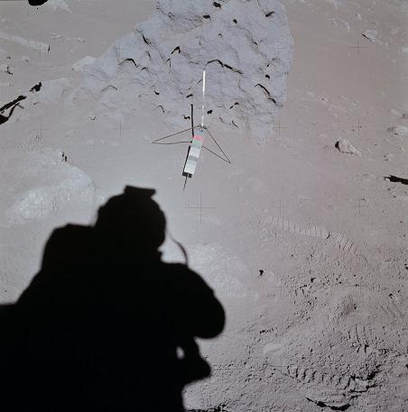 ![]() On the photo AS15-86-11673, we see the tripod with its shadow. ![]() When we take a close-up at the shadow of the tripod, we can see that there is a little stone which hides a part of the shadow produced by the multi-colored strip of the tripod. If this shadow was a black paint on the ground, it would be normal that this stone would hide a part of it, but, as this shadow is produced by the multi-colored strip of the tripod, and that this strip is above the stone, the stone should also be partially shadowed by this strip! |