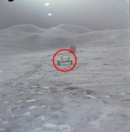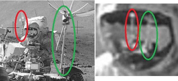 ![]() On the photo AS15-87-11852, we see the rover in the distance. As the rover is seen from quite far away, the distance between the two front wheels and the two rear wheels should show almost no difference (unlike when the rover is seen close), and the rear wheels should appear the same size as the front wheels (with quite no difference). ![]() Yet, when we make a close-up on the rover, the right front wheel of the rover (left seen from the point of view of the photographer) appears bigger than the rear wheel which appears on its right; note that this rear wheel is the same size as the other front wheel, which shows that it is the right front wheel which is oversized; And, as the right rear wheel of the rover appears on the right of its right front wheel, the left rear wheel of the rover should also appear on the right of the left front wheel, and it does not. ![]() I have made a correction of the rover so that the right front wheel return to its normal size, and we see appear the rear left wheel on the right of the left front wheel. |