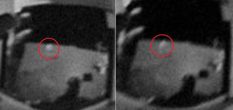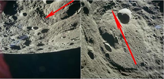![]() In particular, there is a quite recognizable crater, of which all the details match on the two photos. I have drawn on the two photos an arrow indicating the direction of this crater on each photo, and we can see that this arrow turns a quarter of turn clockwise between the two photos. This means that: - Either the spaceship has yawed of a quarter of turn. - Or the astronaut has turned his camera a quarter of turn. The first possibility is to exclude, for the spaceship would never brutally yaw that much. The astronaut could indeed have turned his camera of a quarter of turn, but why would he have done that? When the format of the photo is rectangular, it may have an interest to turn the camera of a quarter of turn so to take the photo in portrait mode instead of landscape, but here the photo is square, so there is no interest in turning it. It can't be said it is outright impossible, but it is illogical, and why would the astronaut do something illogical? |