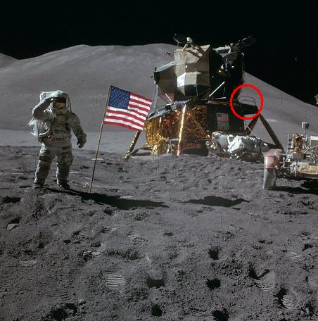 ![]() Now, on the first photo with the lunar module, the camera is oriented so that it can fully see the mount on the right, but not the smaller mount on the left. |