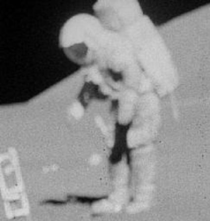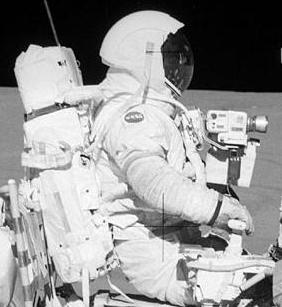 ![]() This is the way the astronaut appears seated on the rover on the photo AS15-85-11470. What is striking on this photo is that the backpack of the astronaut appears abnormally small. ![]() If we compare with the backpack of other photos, the backpack on these ones reaches the top of the astronaut's helmet. The backpack also appears globally smaller on AS15-85-11470; in fact it appears the same size as the fake backpacks they had for public demonstrations on earth, in which they were using backpacks smaller than the real ones, and which had no function of course. |