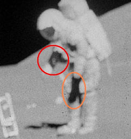 ![]() On the photo AS15-92-12412, we can see the other astronaut in the distance; this astronaut does not make me think of a real astronaut, but rather of a model. ![]() We can see that his right arm is abnormally shadowed; yet, it can't be his left arm which shadows his right arm, for the latter is lower than the right arm, and besides we can see the shadow that it produces (circled in orange). |