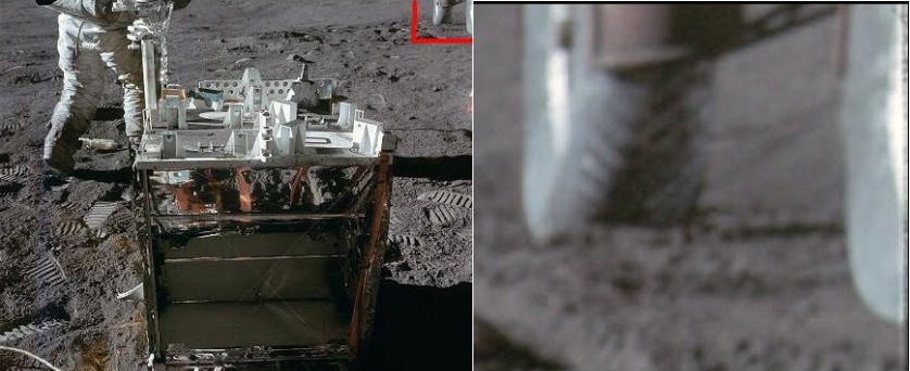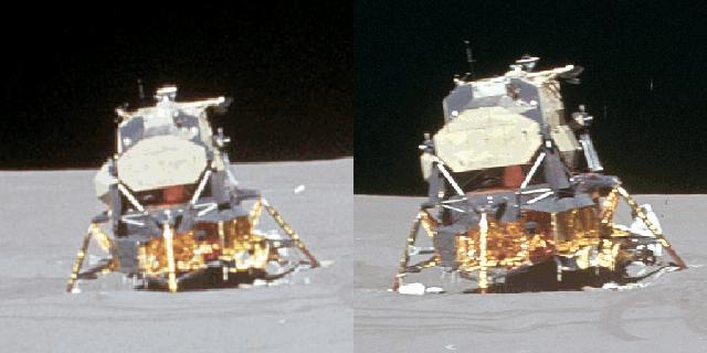 ![]() Here is what we should see on this photo I corrected, we should see the left mount in the background of the photo, on the left of the lunar module. |
