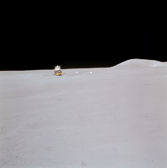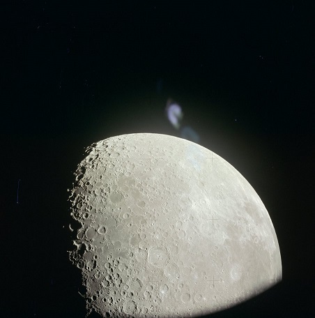 ![]() At the end of the mission, an astronaut takes photos of the moon as the command module is moving away from it. On this photo, AS15-88-12013, we can see the moon completely. |