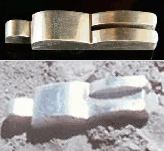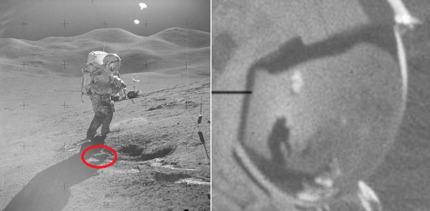 ![]() The photo AS15-88-11894 shows a commemorative plaque put on the "lunar" ground, which bears the names of the astronaut fallen in the conquest of space. Among these names are the ones of Gus Grissom and Yuri Gagarin; both of them have found the death in dubious circumstances. In fact these astronauts are more victims of those who shamelessly exploited them than of the conquest of space. ![]() The corners of this plaque are round, but we can see the shadow of one of them, and this shadow appears like the corner of the plaque was square instead of being round! ![]() Before the commemorative plaque, we see a figure put on the "lunar ground". ![]() This figure would be a statuette made by a Belgian sculptor. ![]() The name of this sculptor would be Paul Van Hoeydonck. He would have baptized this statuette "The fallen astronaut", and given it to the NASA to be put by the astronauts on the lunar ground. But, if we compare the figure supposedly left by the astronauts on the moon with the statuette of Hoeydonck, we can start to doubt that it is really the statuette of the Belgian sculptor. ![]() Indeed, if we look attentively, we can find several differences: 1) First, the heads look different; on the statuette of Hoeydonck, the head is regularly rounded; on the figure of Apollo, the head is first flat, and then there is a sudden angle. 2) On the statuette of Hoeydonck, the chest is perfectly smooth; on the figure of Apollo, the "chest" of the figure is not smooth, we can guess on it the extremity of the handle. ![]() Like we can see the extremity of the handle on other hammers' heads. ![]() 3) Finally, on the statuette of Hoeydonck, the legs of the fallen astronaut are close to each other, and, on the figure of Apollo, they are more spread. ![]() For me, it makes no doubt that what we see is in fact a hammer, of which the handle in entirely dug into the ground, and of which only the head is visible. |