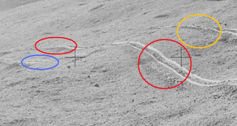 ![]() On the photo AS15-90-12192, we see the tracks of the rover. ![]() What is surprising is that there is a track (I have circled in red) which starts as the left track...and suddenly becomes the right track (for it is on the right of the other track I have circled in blue, and which is now the left track. |