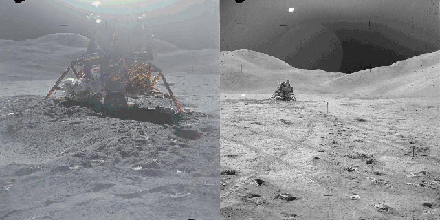 ![]() On the second photo, he has moved right, and consequently he sees the lunar module under a different angle. The consequence is that the background he sees is shifted left; this is why the mount he was seeing on the first photo is no more visible, it has shifted right out of the photo. |