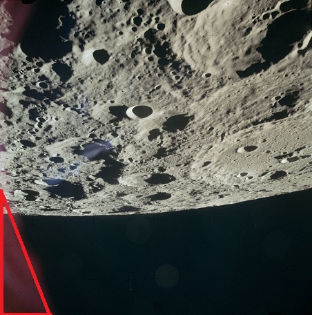 ![]() On the previous photos, the command module is closer to the moon, so we see the moon only partially. In particular, on this photo, AS15-88-12012, we can see a big part of the moon, but not as completely as on the photo AS15-88-12013. Something has struck me when I have seen this photo: The curvature of the moon on this photo is too exaggerated for a photo which only shows a part of the moon, and not in its entirety. |