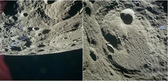 ![]() This stereoscopic view shows two different views of the moon taken from the command module, AS15-88-11985 and AS15-88-11986. On the two photos we can recognize the same artefacts. |