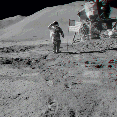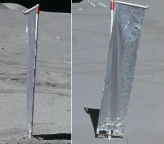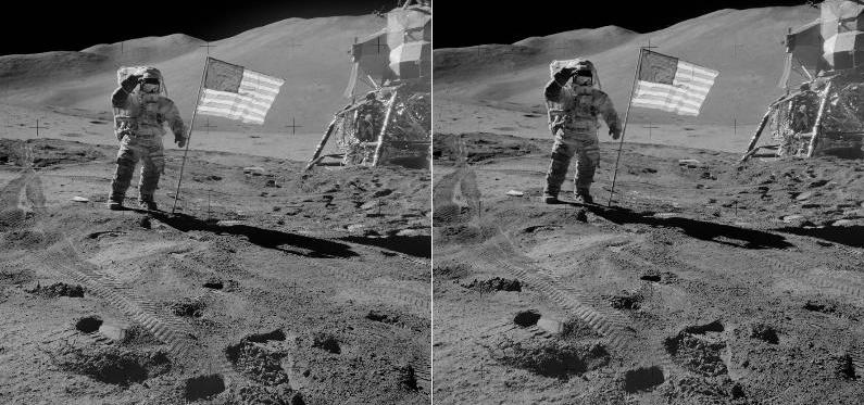 This is what we see if I make an animation with the photos AS15-92-12450 and AS15-92-12451; the change we see comes of course from the fact that the photographer has moved (around approximately an arc of circle), but what is abnormal is that the flag should show a change of orientation on these two photos, and it does not. I have made a new animation with the orientation of the flag corrected on the second photo; of course I don't guarantee that the orientation of the flag would change this way, but, at least, here, we can see a change of the orientation of the flag when the photographer moves. |