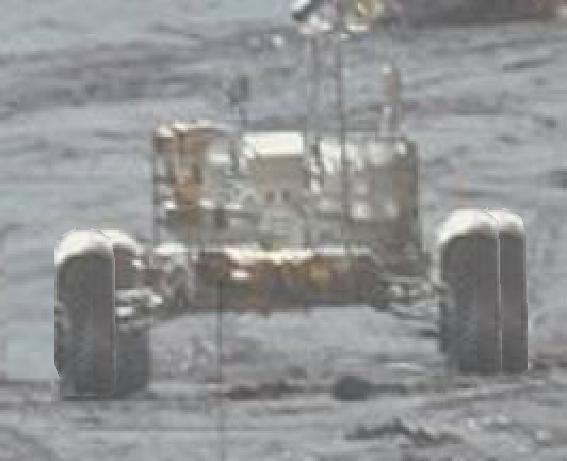 ![]() The photo AS15-86-11592 shows the ALSEP in the foreground, and the rover farther in the background, that we can see on the top right of the photo. When the rover is taken close, the front wheels may seem bigger than the rear wheels (if the rover is taken in front), but, when the rover is taken from a distance, the distance which separates the wheels becomes small relatively to the distance which separates the rover from the photographer, and, in that case, the difference of size between the front wheels and the rear wheels becomes also small. ![]() But, when we take a close-up at the rover, the front wheel appears consistently bigger than the rear wheel, like the rover was taken close! The rover has probably been first taken close, and then pasted in reduced size on the top right of the photo. |