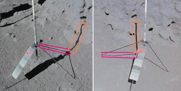 ![]() The photo AS15-87-11766 shows the tripod near a rock. ![]() And the next photo, AS15-87-11767, shows another view of the same tripod. ![]() The first observation is that the shadow of the part of the leg which is before the multi-colored strip (I have framed in red) is too long relatively to the shadow of the multi-colored strip itself. The second observation is that the width of the shadow of the multi-colored strip is irregular. The third observation is that one of the shadows of the legs is singularly straight, like drawn with a rule; it is the shadow of a leg which is not visible, for it is hidden by the central column. The shadow of the central column on the rock appears distorted, which is not necessarily abnormal. ![]() But, it is when we compare the shadows of the two photos that it becomes interesting: - The shadow of the leg which is hidden by the central column on the first photo (framed in red) is straight on the first photo, but distorted on the second one. - And the shadow of the central column (framed in orange) which appears distorted on the first photo appears almost straight on the second photo! |