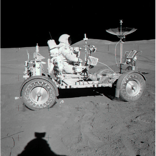 ![]() The photos AS15-82-11200 and AS15-82-11201 show two different views of the rover which are shown on this stereoscopic view. Visibly, on the photo AS15-82-11200 (left of the stereoscopic view), the camera is oriented such that the sunlight reflecting on a metallic element on the front of the rover comes right into the lens, which explains the blur we see. On the next photo (right of the stereoscopic view), the rover is taken under a very different angle of view, so we might expect the sunlight reflected by this metallic element not to come into the lens this time...and yet it does again! |