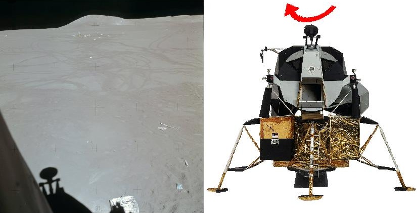 Because... ![]() ...When we look at a close-up of the lunar module on the two photos, we can see that the lunar module of the second photo is turned counter-clockwise relatively to the lunar module of the first photo. This is because the photographer has not only moved forward, but also shifted right, which has changed the angle of view under which he sees the lunar module. |