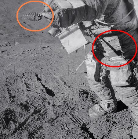 ![]() On the photo AS15-85-11419, the shadow (circled in red) cast by the sample bag (circled in orange) is too thin in reason of its orientation; it could only be that thin if the astronaut was holding it parallel to the direction of the shadow, which is obviously not the case; you can also see that the sample bag is in oblique, and its shadow should thence normally touch the astronaut's shadow. ![]() On the same photo, the stick the astronaut is holding seems to cast a shadow (circled in red) on his right boot; the problem is that the end of the stick (circled in orange) is too high to cast this shadow! |