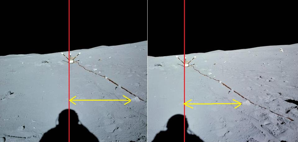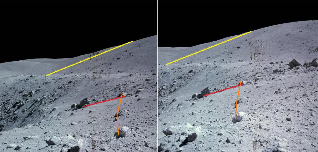 ![]() On photo AS16-109-18700 (right), we can see that the stones in the foreground have moved on the right relatively to the background; thence the photographer has moved on the left; the vertical stick should have rotated clockwise relatively to the (yellow) horizon line, but it has rotated counterclockwise instead (of course I didn't measure on the picture I present). |