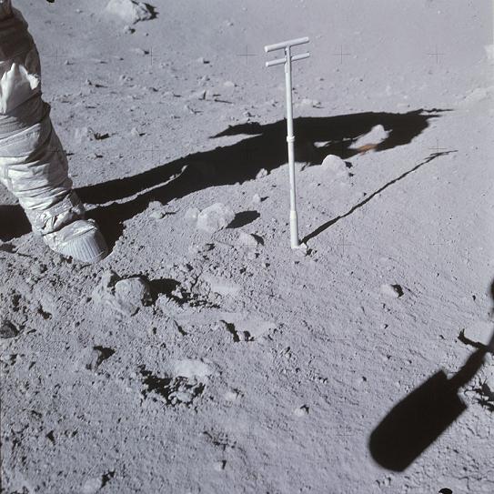 ![]() This is a part of photo AS16-107-17552. We can see the shadow of the upper end of something the astronaut is holding...but on the photo we can't see the lower end of this something. |