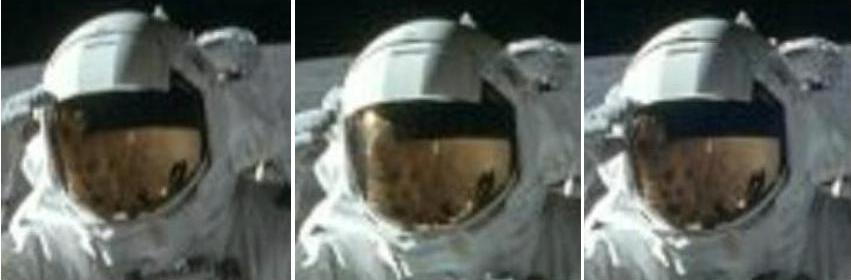 ![]() Here is a double view of the astronaut on the two first photos. I have circled the sun reflections which appear on the second photo. The first impression is that the reflections are missing on the two other photos because the astronaut was shielding the sunlight with his hand. |