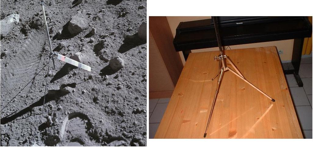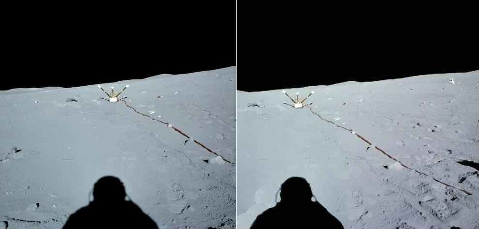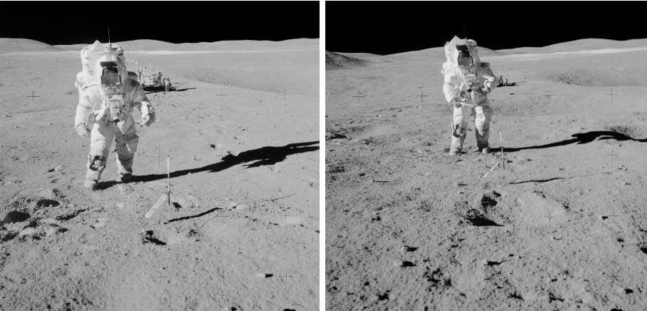 ![]() On photo AS16-107-17459 (left) we can see a vertical pole (with a double handle) and furthermore the shadow of this pole we can also see the shadow of a pole which is behind. On photo AS16-107-17460 (right) we can now see the vertical pole which is behind and was hidden on the previous photo, but we can no more see its shadow! |