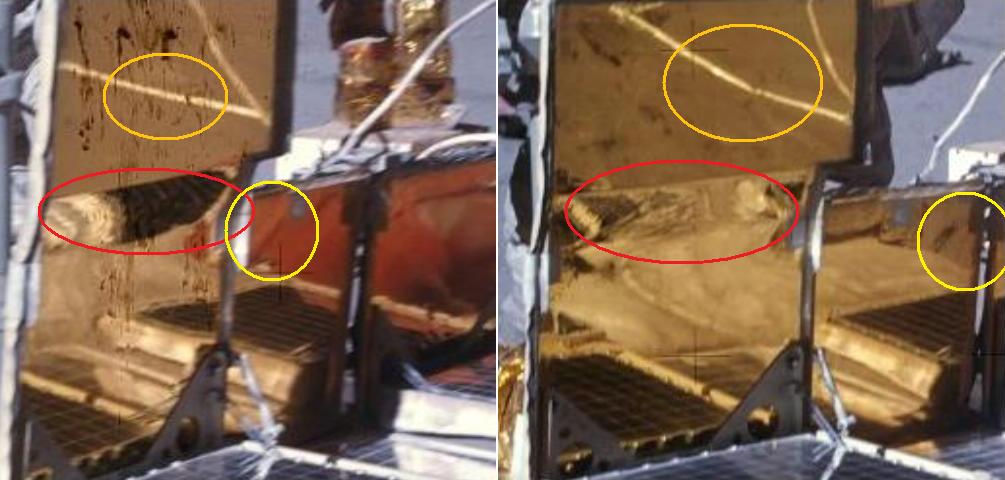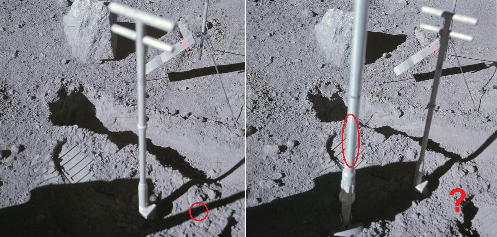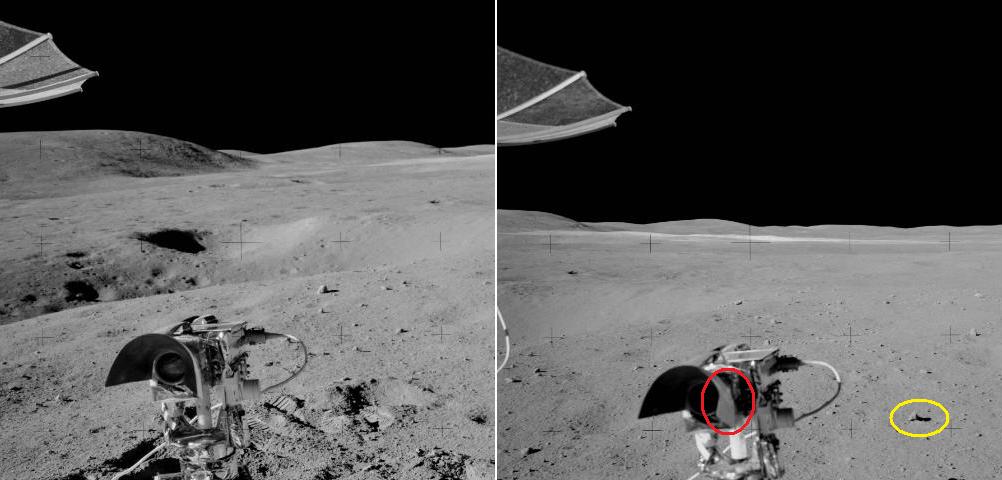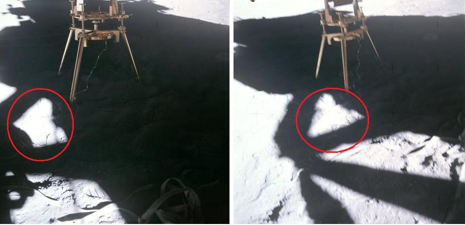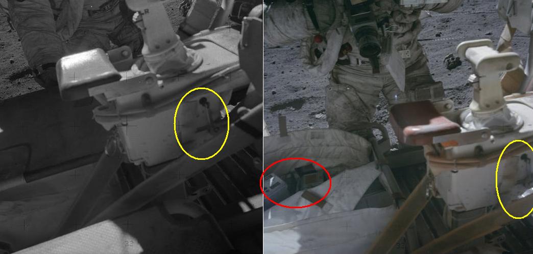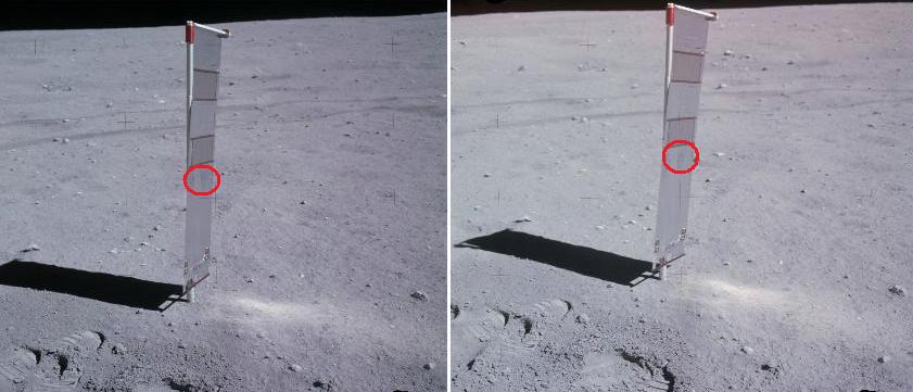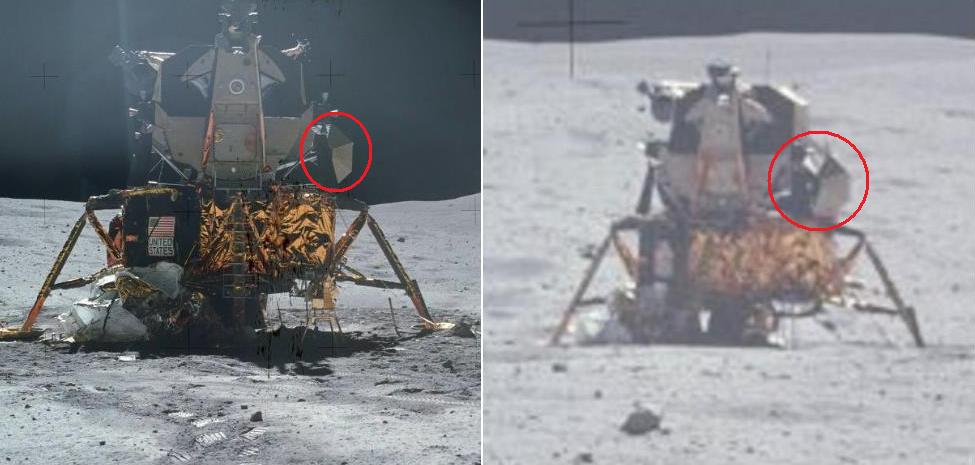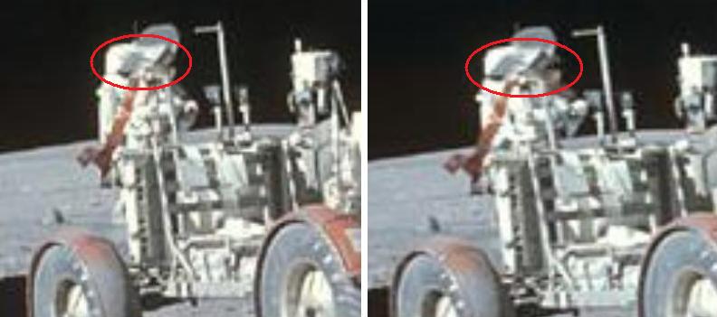 ![]() On photo AS16-116-18718, there is an object on the reflection of the solar battery (I have circled in red) which is absent on the reflection of the photo AS16-116-18719! ![]() One could say that if the object has disappeared, it's because of the change of angle of view, but it's not the case: - Look how the object I have circled in red is positioned above the two solar cells planes which are under. On the second photo, this object has pivoted and should still be visible; a part of it is still visible, but a good part of it has vanished. - On the first photo, the right side is red; on the second photo, we see the part of this side which is beyond the second solar cells plane; this part is red on the first photo, but not on the second one. - On the top of the photos, we see a couple of wires; one is straight on the first photo, and bent on the second one. |
